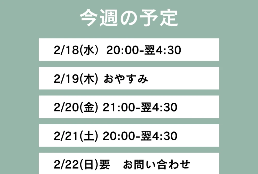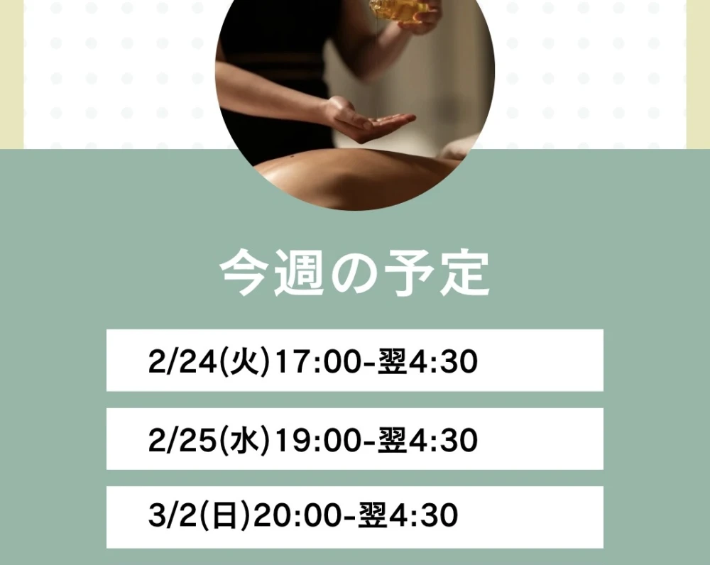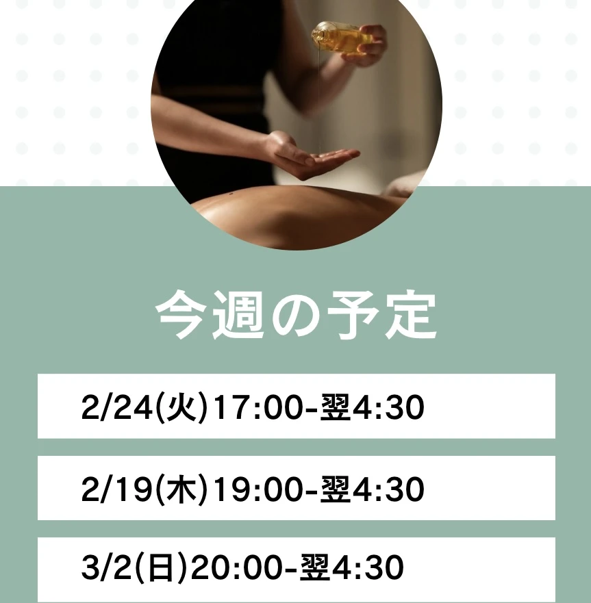 営業時間 10:00~翌6:00受付時間 9:30~翌4:00TEL : 070-6517-4581