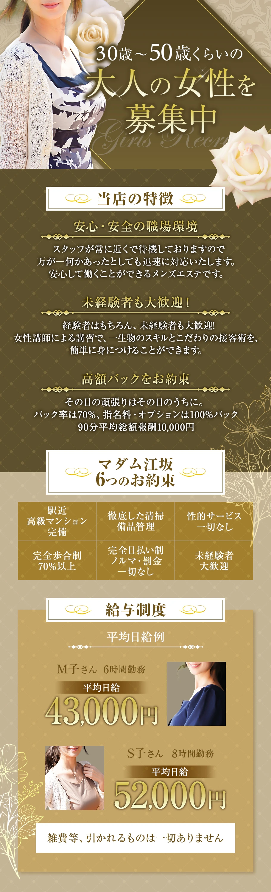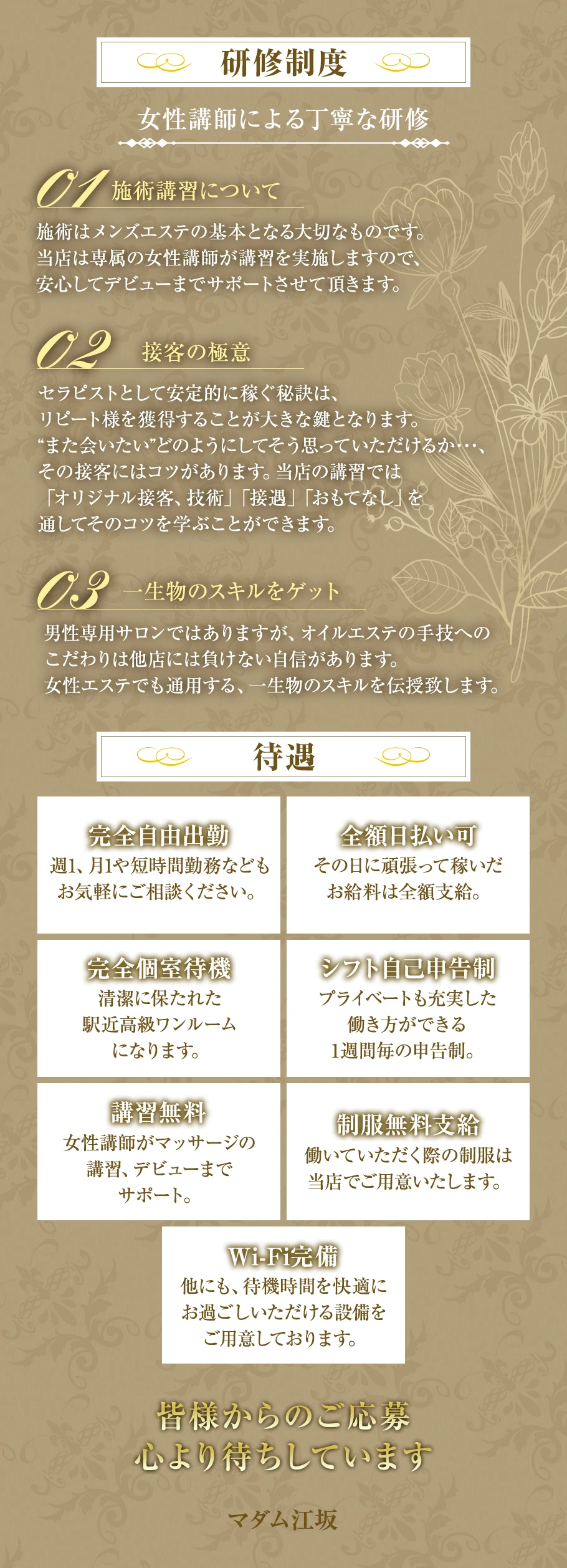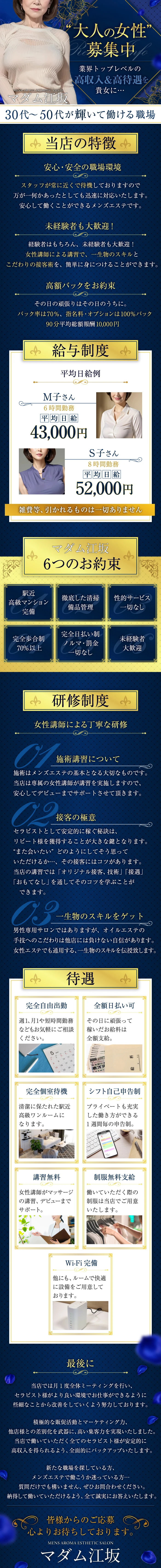 90分コース 9,000円+α(各種手当)平均1件あたりのお給料は10,000円以上になります。しっかりと稼げるお店・集客力とリピート率には自信があります!未経験だからといって報酬が安くなることは一切ございません。実績のある方は高バックスタート可能 これまでの経験を活かして頂けます♪完全歩合制50~80%バック あなたの頑張りはお給料にて還元いたします!